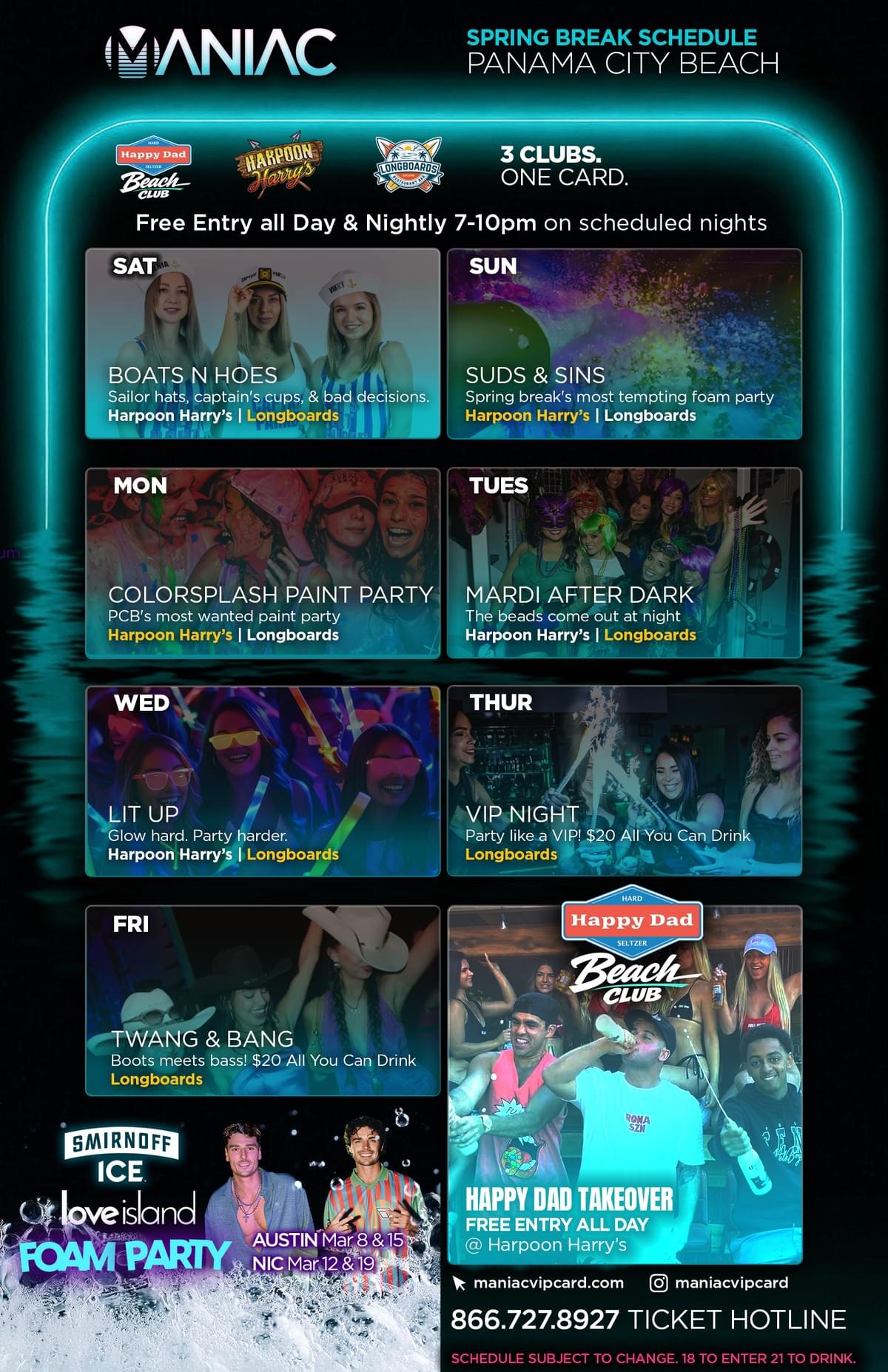 ***SPRING BREAK 2026 MANIAC VIP CARD CALL 866-727-8927 NOW OR STOP BY THE HARPOON HARRY'S (12627 FRONT BEACH RD) TICKET STAND